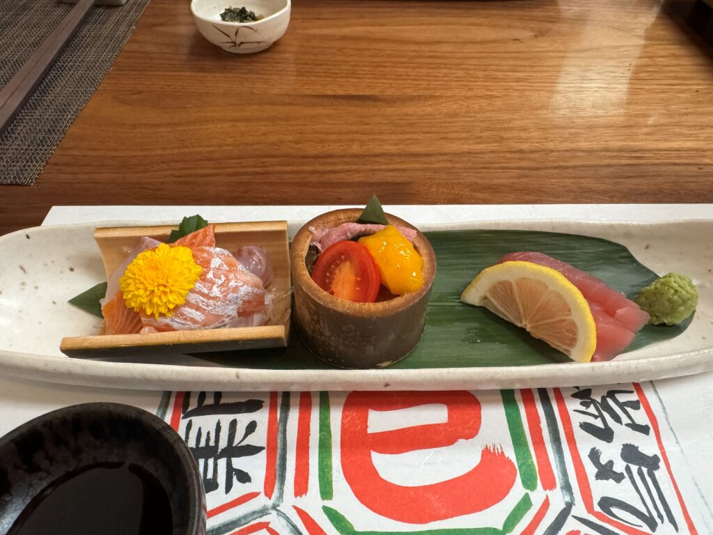 左からナマズの昆布締め&サーモン、飛騨牛のローストビーフ(上にかかっているのはマンゴーソース!)、マグロ