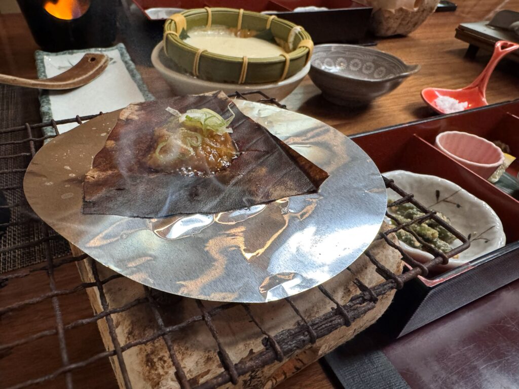 手前の穴ぼこの食べ物は「こもどうふ」という岐阜の郷土料理らしい