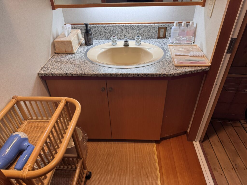 洗面台には歯ブラシ、KOSEの化粧水類、ヘアブラシ、お風呂場、大浴場にはシャンプー類もあるので、お気に入りのものがあるわけでなければ持ってくる必要なし!